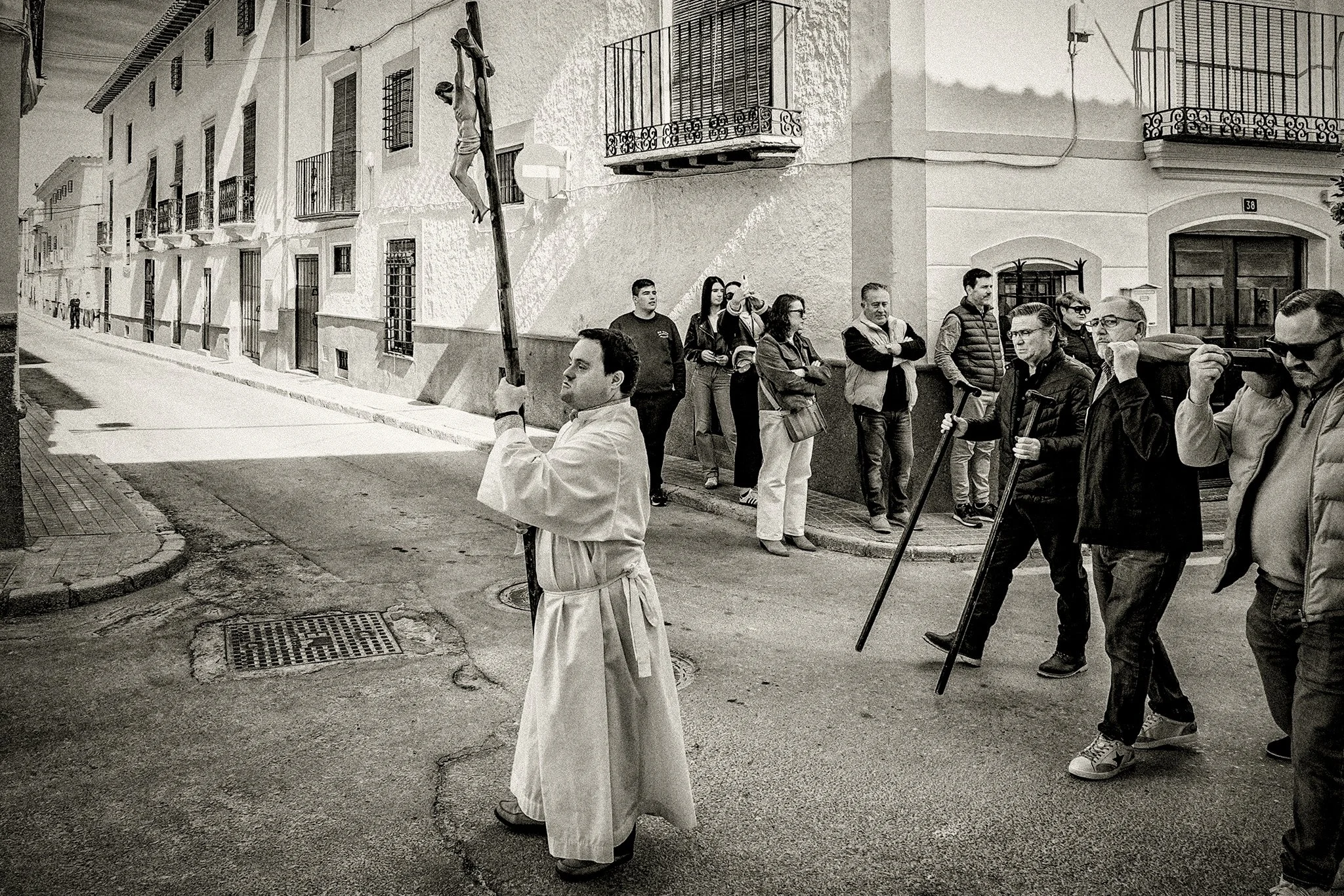 I was able to photograph three processions this year. Two night time processions that ran back to back on Maundy Thursday in the town of Baza, some forty kilometres away, and one on the late morning of Easter Sunday in my own village of Galera. Baza, though a smalltown was spectacular, and even someone as Godless as I, couldn't fail to be moved by thesolemn atmosphere that settled over the inhabitants, and I followed along for some three or four hours as the penitents progressed slowly through the narrow streets to the soundsof marchas processionales, mournful compositions specifically written for the marching bands. Here in Galera, two relatively small pasos bearing the figures of Jesus Christ and Mary are carried by separate routes from the church. They meet high in the village before continuing their climb together, following the route of the stations of the cross to the hill of Las Cruces...Unlike Baza, with its two, one hundred strong, uniformed marching bands, the procession here is lead by a dozen or so of the younger villagers. Dressed in polos and sweats, with shoulder drums and a handful of brass instruments they still sound incredible, and as they progress through the tiny streets the villagers are drawn from the houses, gradually joining the body of people following along.