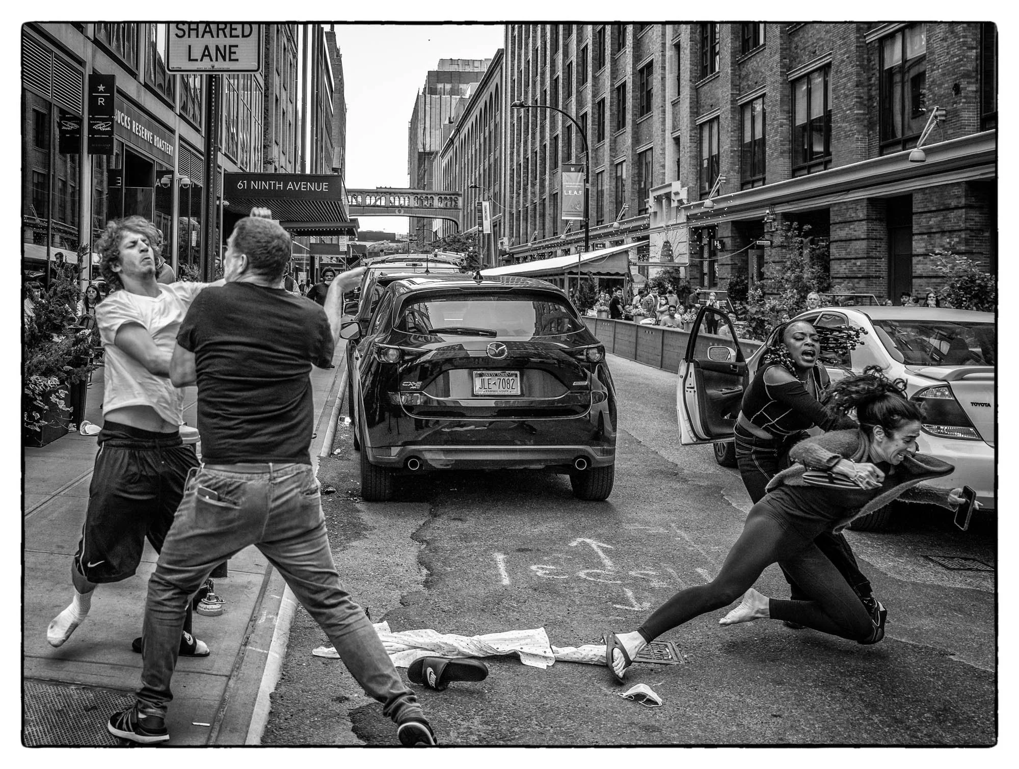 Just a normal day. This was taken in the Meatpacking area in New York City. There was a flower show with large crowds and traffic. A car made a turn and almost hit a women, she tossed her phone at the car and hit it. The driver in the white T shirt got out and things got crazy for a minute or so..I was lucky to be in the right place at the right time. No one was hurt.